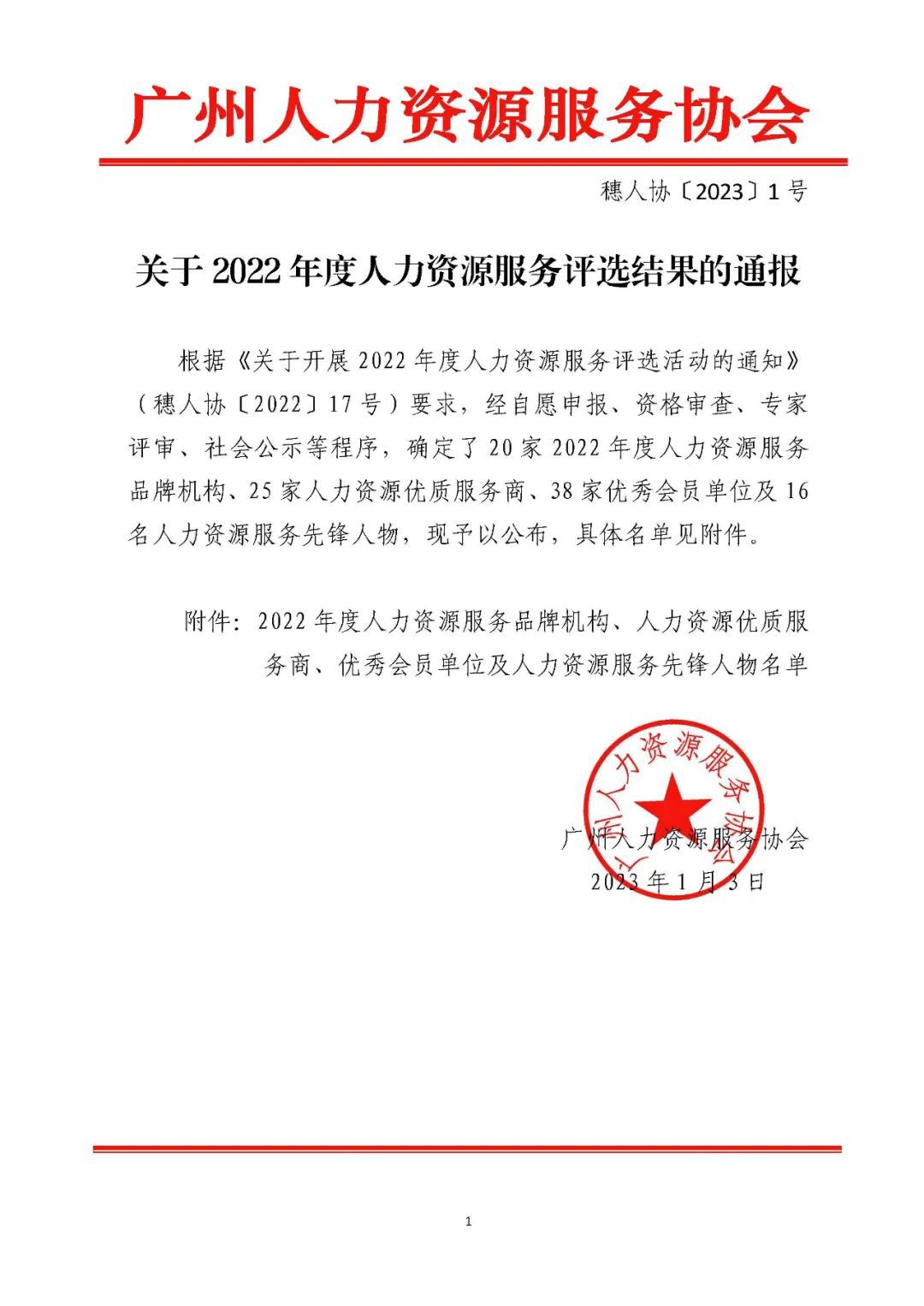 关于2022年度人力资源服务评选结果的通报,祝贺乐鱼(中国)一站式服务平台集团